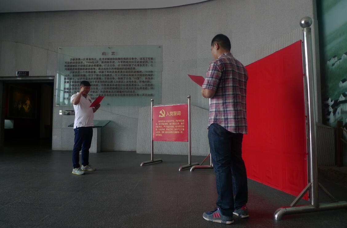 在沙家浜抗日紀念館,新入黨的張仕恩同志面對黨旗莊嚴宣誓,全體黨員也面對著(zhù)黨旗重溫入黨誓詞,莊嚴向黨宣誓,表達了對黨的忠誠和信仰。短短一天的行程,東進(jìn)橋、抗日司令部、民俗街、葉飛委員長(cháng)題詞的照壁、軍民魚(yú)水情主題雕塑等等都給我們留下了深刻的印象。